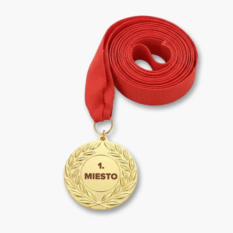Kovová medaila s červenou stuhou. Zlatá kovová medaila s červenou stuhou a hladkým povrchom. Ideálna pre gravírovanie loga či textu. Kvalitné spracovanie pre športové a spoločenské podujatia.