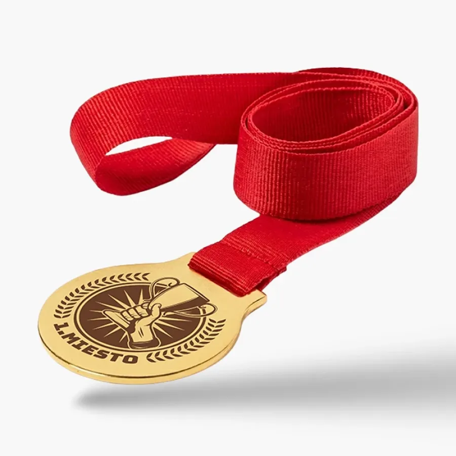 Kovová medaila s červenou stuhou. Zlatá kovová medaila s červenou stuhou a hladkým povrchom. Ideálna pre gravírovanie loga či textu. Kvalitné spracovanie pre športové a spoločenské podujatia.