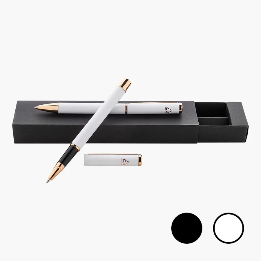 Obsahuje guľôčkové pero z recyklovaného hliníka a roller s pogumovaným povrchom a detailmi ružového zlata s modrou náplňou. Obe položky majú špeciálnu povrchovú úpravu určenú pre laserové gravírovanie.