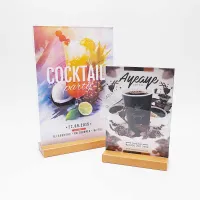 Akrylátový stojánek s dřevěným podstavcem na stůl či pult vaší restaurace, kavárny nebo bistra ve světle hnědém provedení. Vkusně tak doplníte váš interiér a nalákáte zákazníky na vaše speciality. Dřevěný podstavec je možné gravírovat laserem z obou stran.
