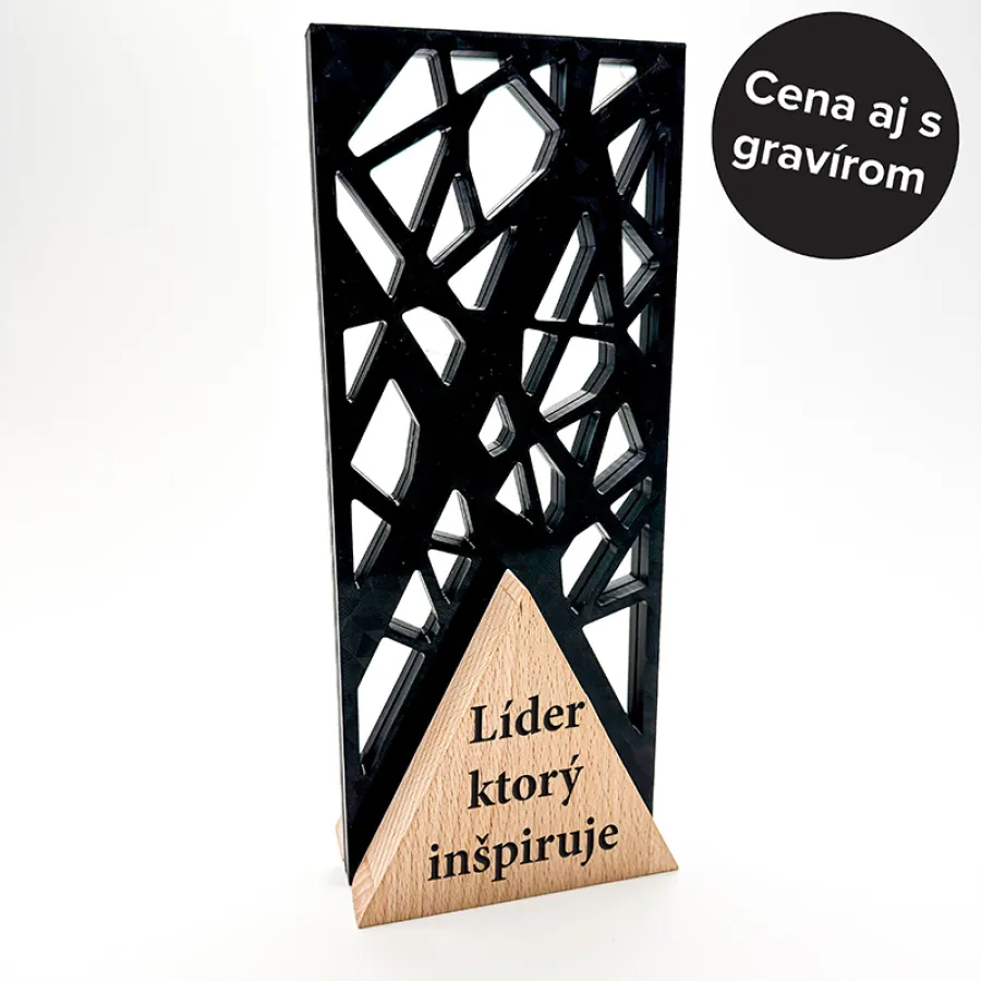 Originální kombinace přírodního dřeva a precizní 3D tisku. Design s geometrickým 3D motivem v kontrastu s jemnou dřevěnou základnou vytváří elegantní ocenění pro výjimečné osobnosti. Ideální jako firemní nebo osobní poděkování.