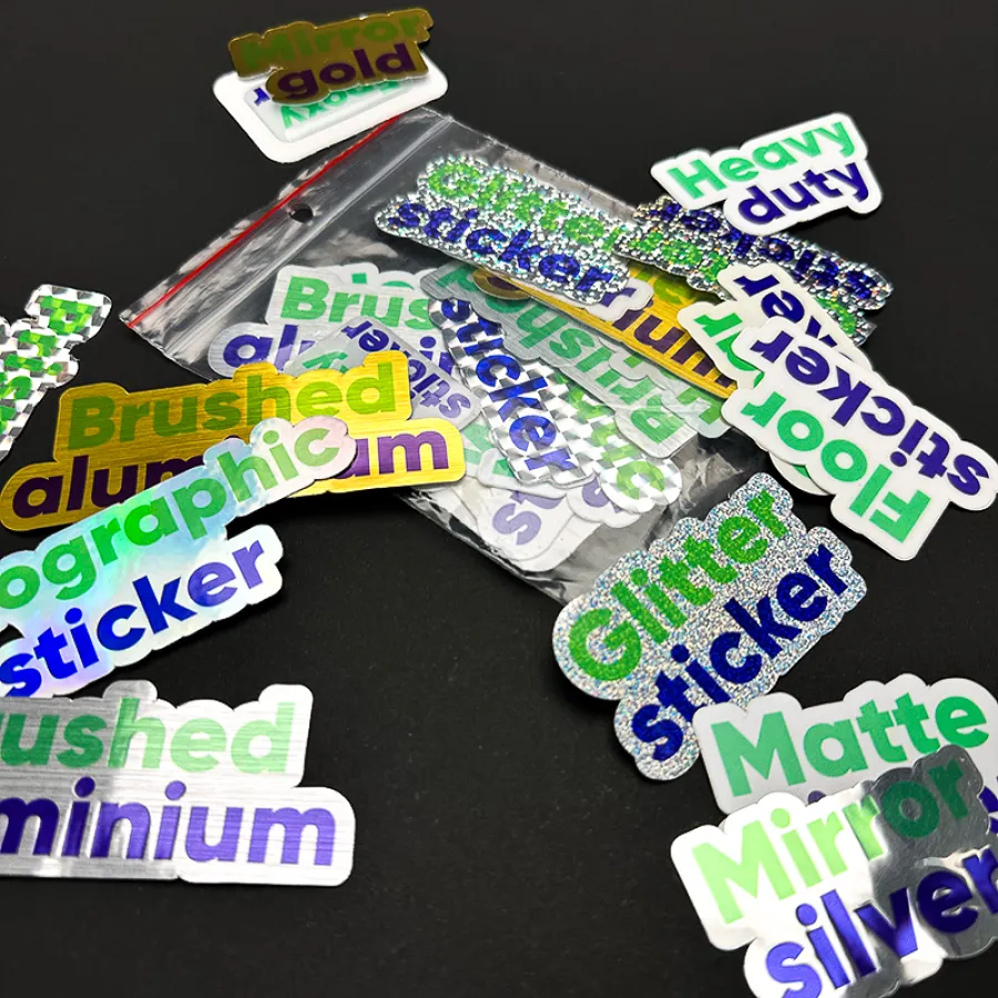 ukážky rôznych druhov samolepkových materiálov (matné, lesklé, metalické a iné),